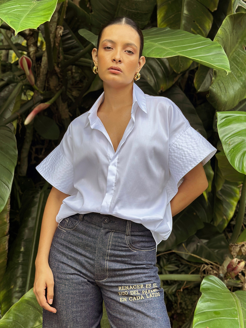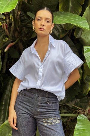 Una camisa en algodón que encuentra su fuerza en los detalles. Su silueta limpia y relajada se complementa con mangas amplias que incorporan un trabajo de pespuntes visibles, creando una textura sutil en relieve que trasforma la prenda sin recargarla. Es fresca, ligera y fácil de llevar, ideal para climas cálidos, pero con un diseño que se sale de lo básico gracias a ese juego de textura en las mangas. Una pieza que equilibra sencillez y carácter.