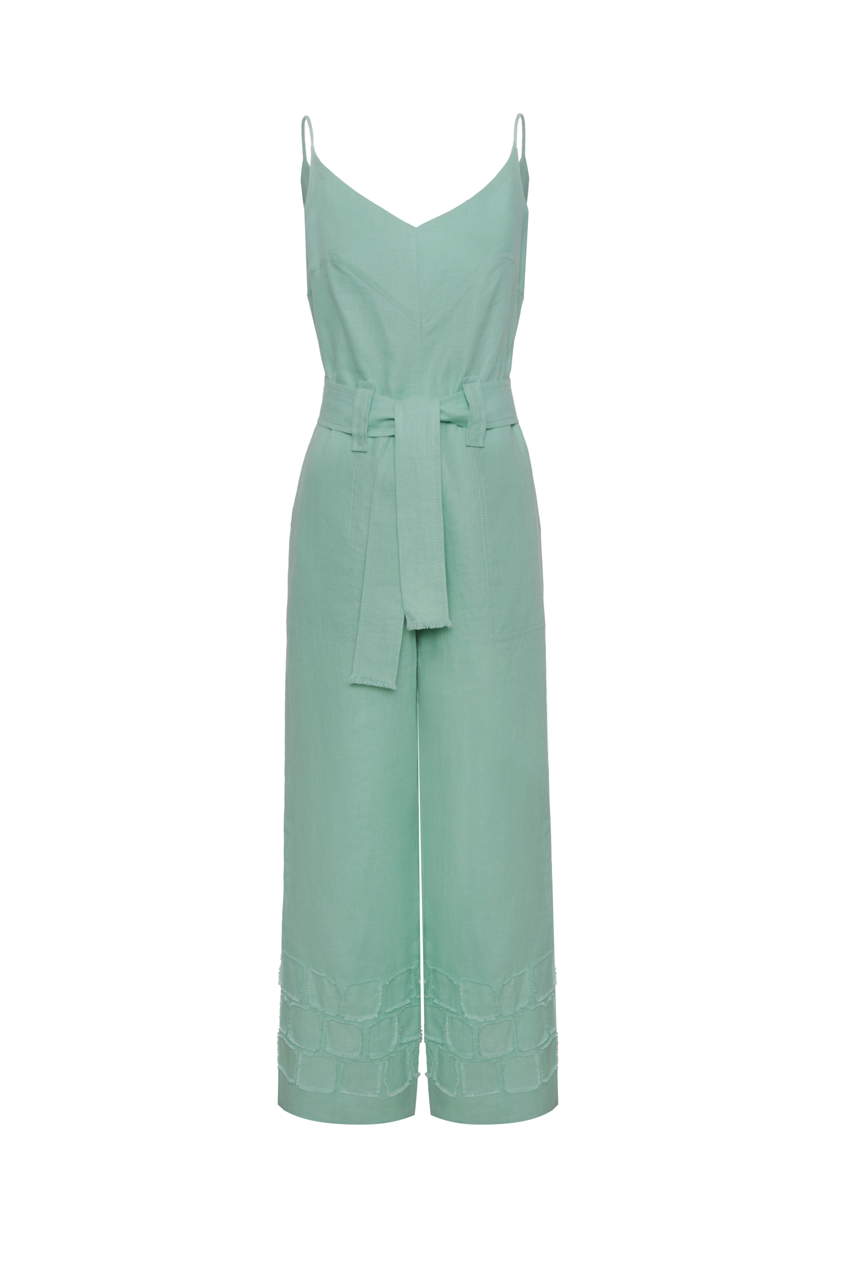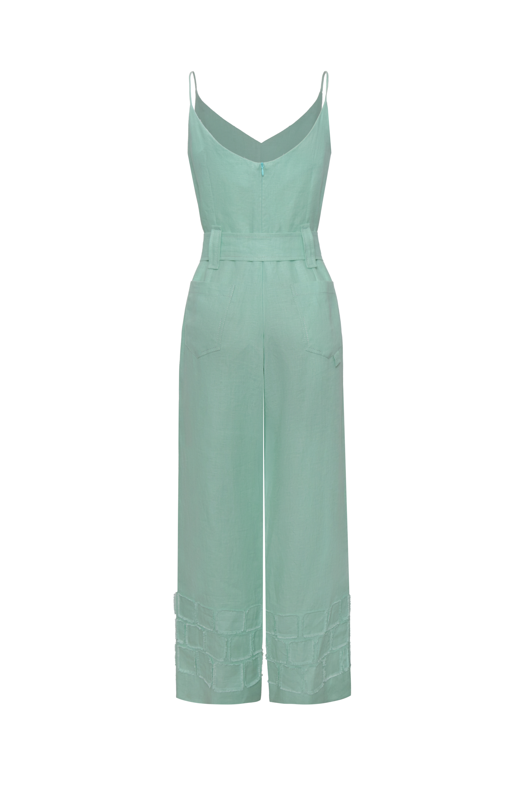 Enterizo largo de silueta recta y amplia. En el delantero presenta escote en V suave con tiras delgadas y costuras de entalle en el busto. Cuenta con bolsillos laterales ocultos en costura. La cintura incorpora pasadores y cinturón del mismo material. En la parte inferior de las piernas presenta aberturas laterales y aplicación de piezas textiles en forma de cuadros con acabado de bordes desflecados (raw edge), que aportan un carácter artesanal.