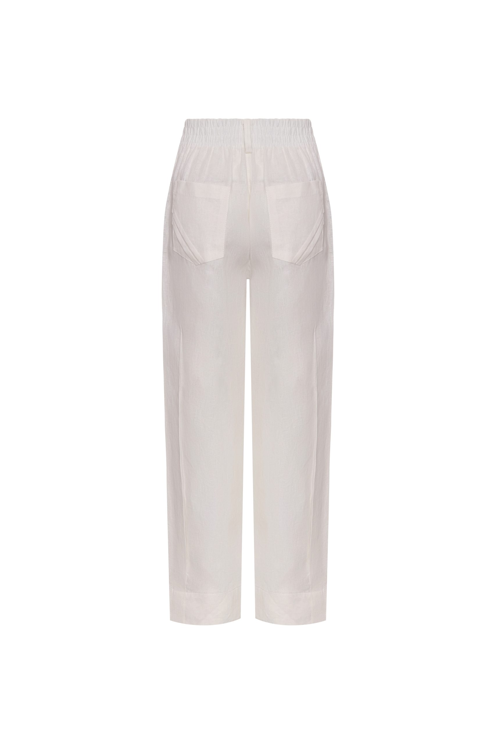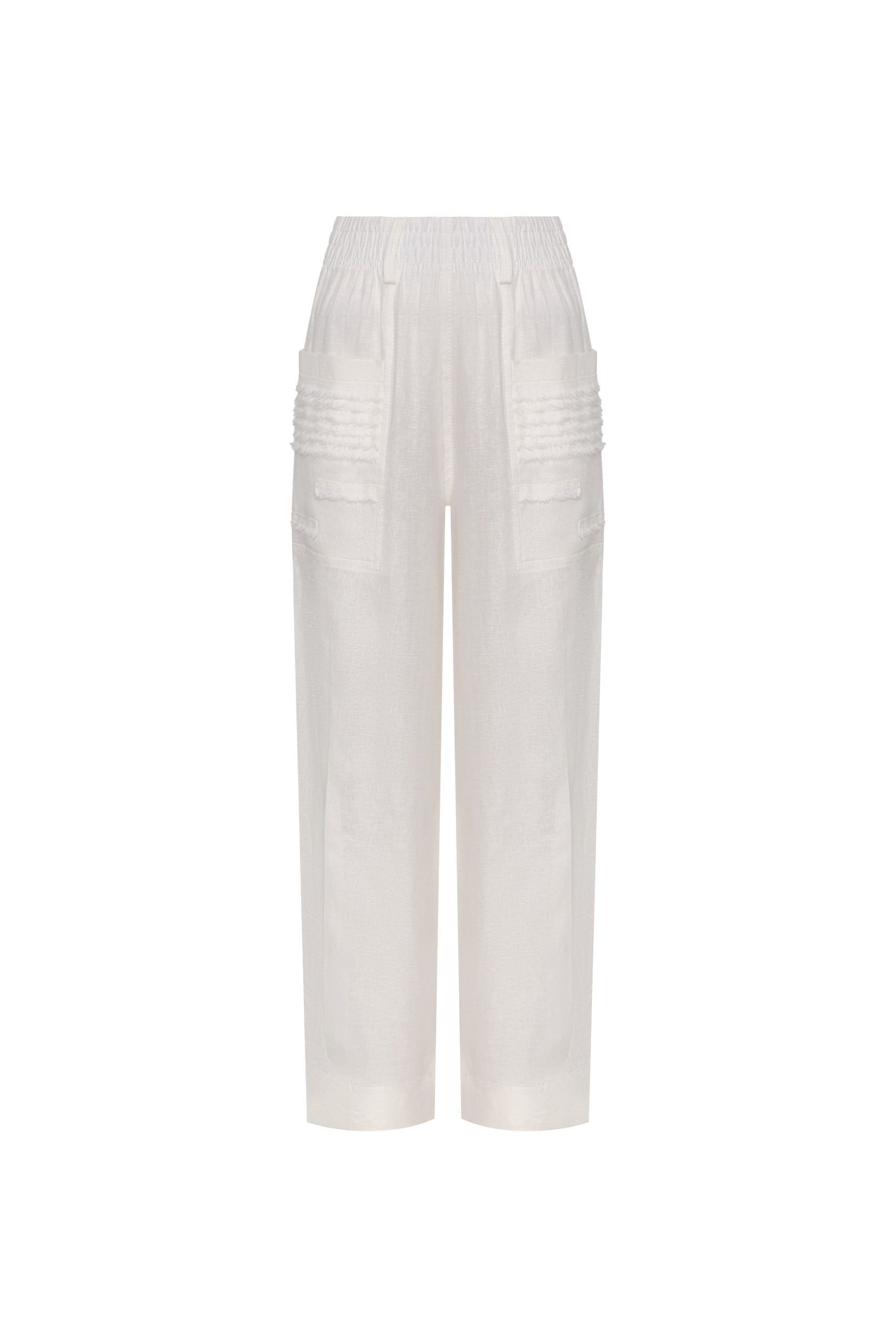 Pantalón de tiro medio con silueta recta y relajada, y pretina resortada que brinda comodidad y ajuste. Presenta bolsillos delanteros tipo parche con detalle deshilachado artesanal aplicado directamente sobre el bolsillo, generando una textura orgánica. Incluye una línea vertical que nace desde el ruedo hacia arriba, aportando estructura sutil y alargando visualmente la pierna. En la parte posterior incorpora un bolsillo con detalles textiles delicados. La silueta es fluida, con una caída limpia y natural.