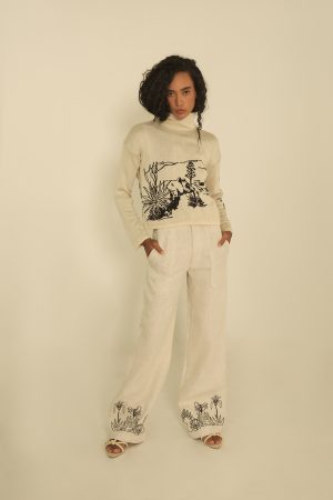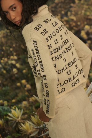 Nuestro Saco Bruma ofrece a tu look una silueta recta, cuello alto y caída suave. Es una prenda que te envuelve con calma y significado. En el frente, un bordado ilustra al oso andino entre frailejones, símbolos de nuestros páramos. En la espalda, un texto en gran formato invita a la introspección: “En el silencio de la bruma encontramos nuestro renacer. Cada instante es un nuevo comienzo, una nueva floración que somos”. La manga izquierda completa el mensaje, entrelazando palabra e imagen en un solo relato visual.