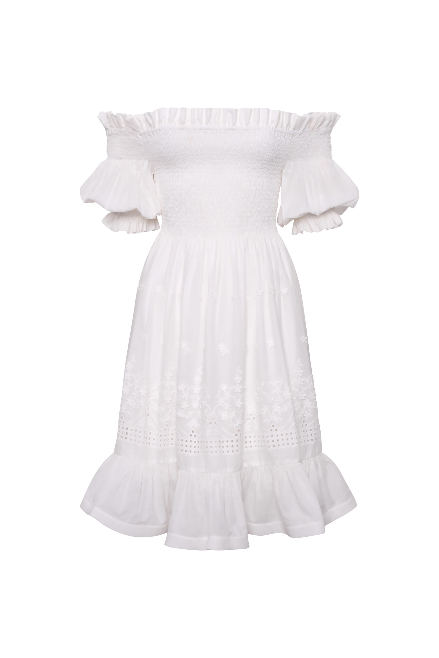 Amelie, nuestro vestido con hombros descubiertos confeccionado en 100% algodón liviano, está diseñado para sentirse suave al tacto y fresco sobre tu piel. La pieza presenta un ajuste fruncido en nido de abeja, que se adapta a tu torso y define tu silueta sin oprimir. Sus mangas cortas abullonadas terminan en un delicado volante que aporta volumen y un toque romántico a tu look. La falda cae con un vuelo suave desde la cintura y finaliza con un amplio volante al final. Sobre la tela se despliega un bordado tono sobre tono de pequeñas flores que parecen flotar sobre el algodón, acompañado de una franja calada cerca del ruedo que deja ver sutilmente tu piel y aporta mayor ligereza al diseño. Un vestido blanco, femenino y versátil, perfecto para que puedas lucirlo en días soleados, celebraciones al aire libre o vacaciones.